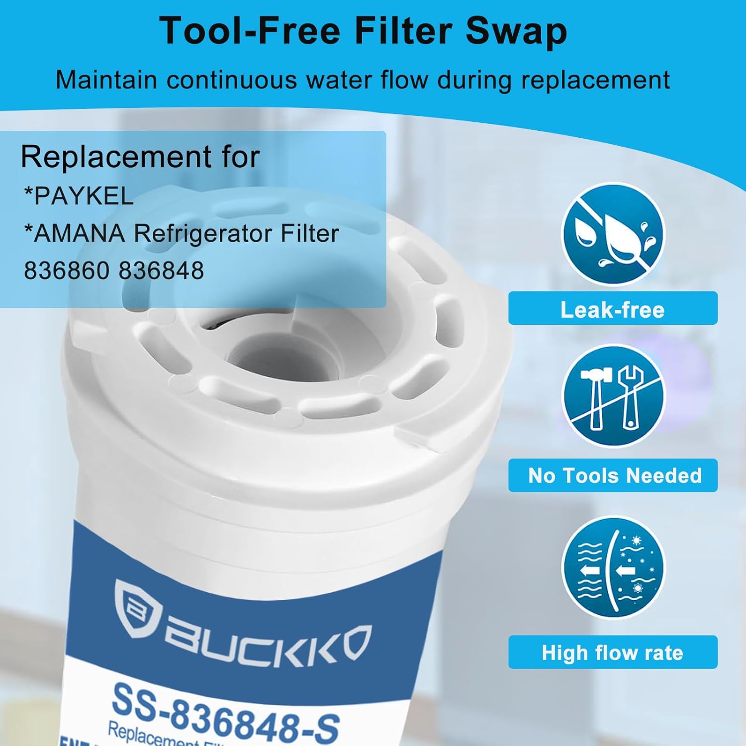 xBrand New BUCKKO water filter compatible with all Fisher & Paykel refrigerator models that take an external filter. It replaces various filter cartridges, including the 836860, R0185011 and 67003662. FPEXT 836848 may also be used in Haier Refrigerators.