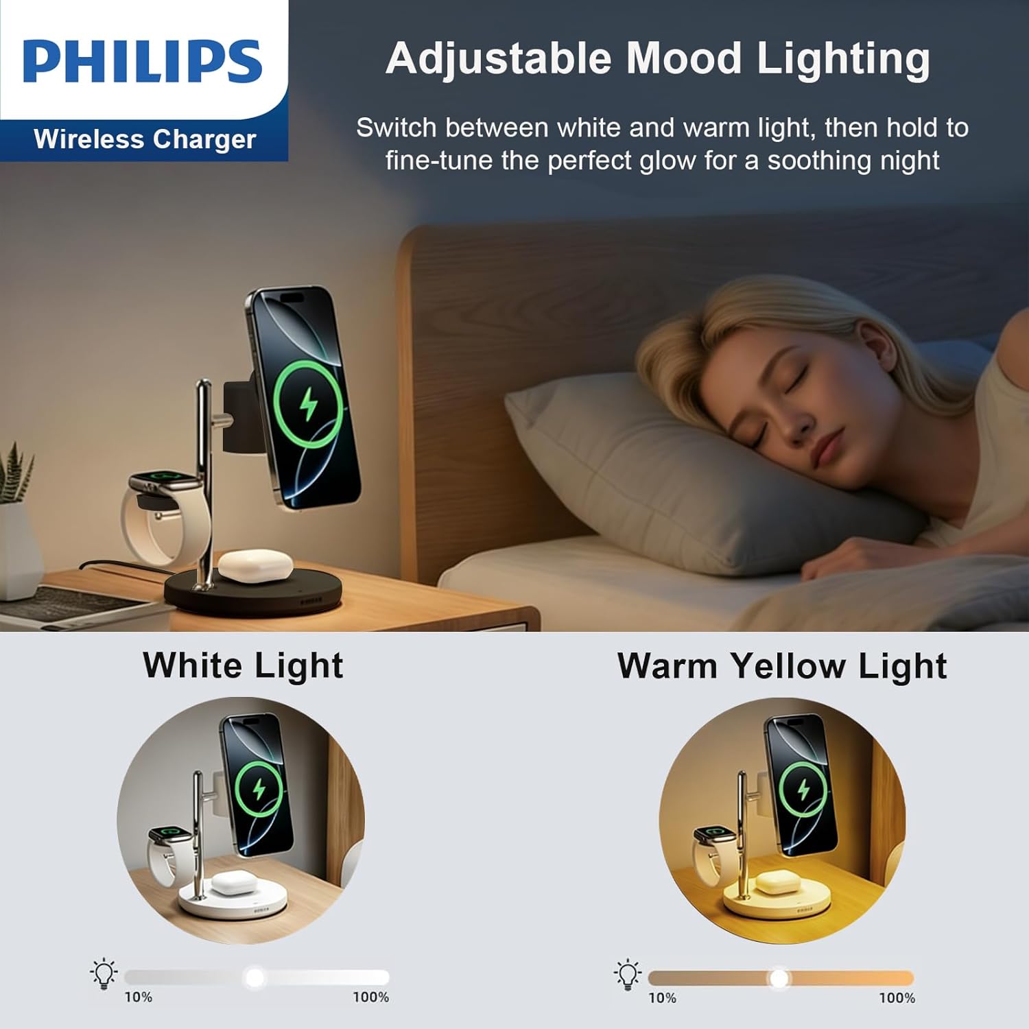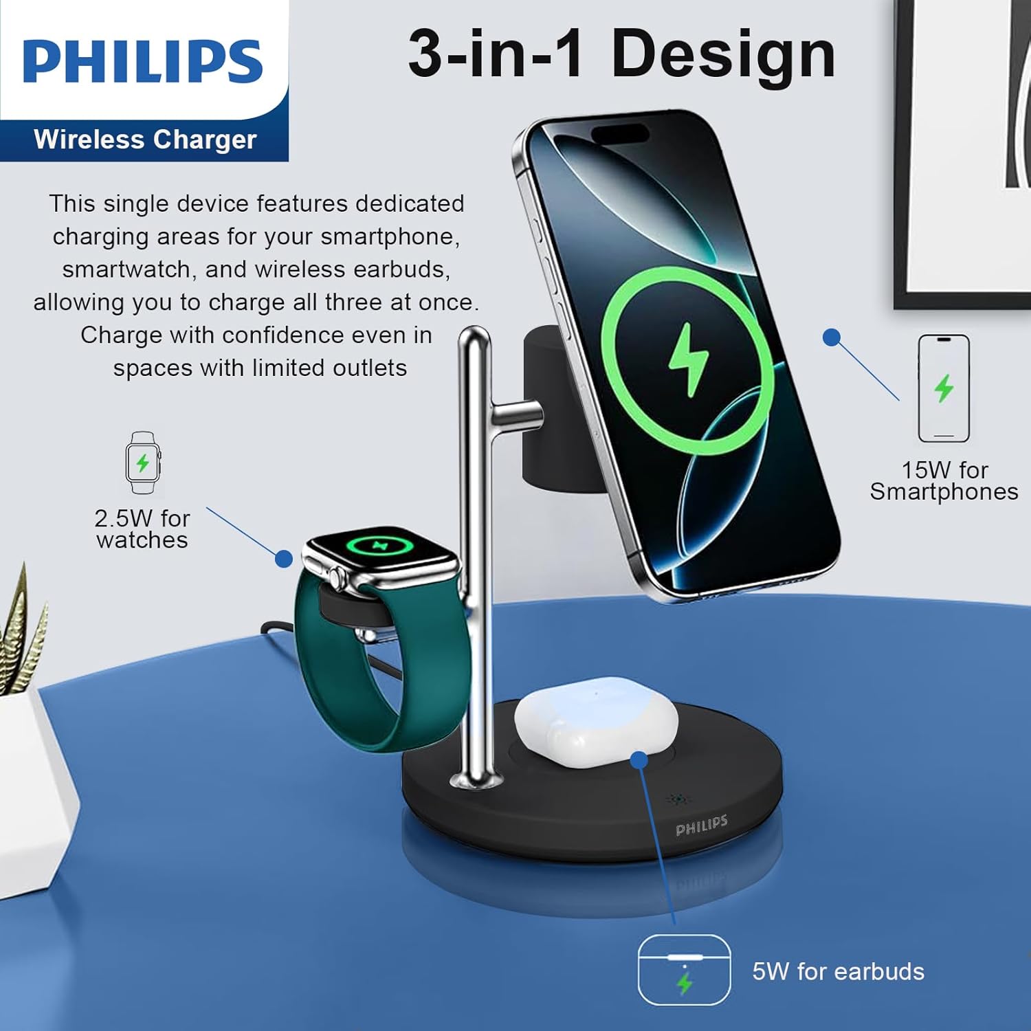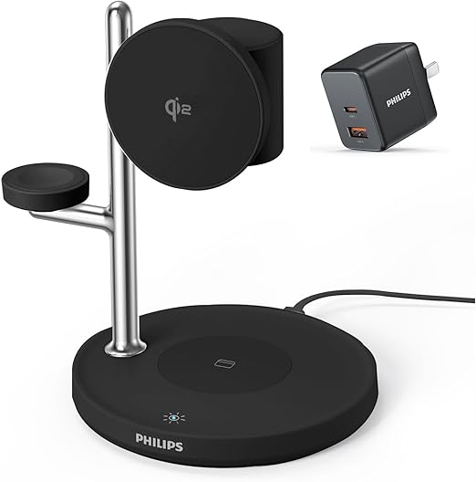 - 【Charge Up to 3 Devices at Once】 Power your iPhone, Apple Watch, and AirPods simultaneously with this Qi2 3‑in‑1 wireless charging station. Also compatible with Samsung Galaxy Devices. A great way to keep your nightstand or desk neat and cable‑free. (For best performance, use the included 30W Philips USB‑C PD adapter.)