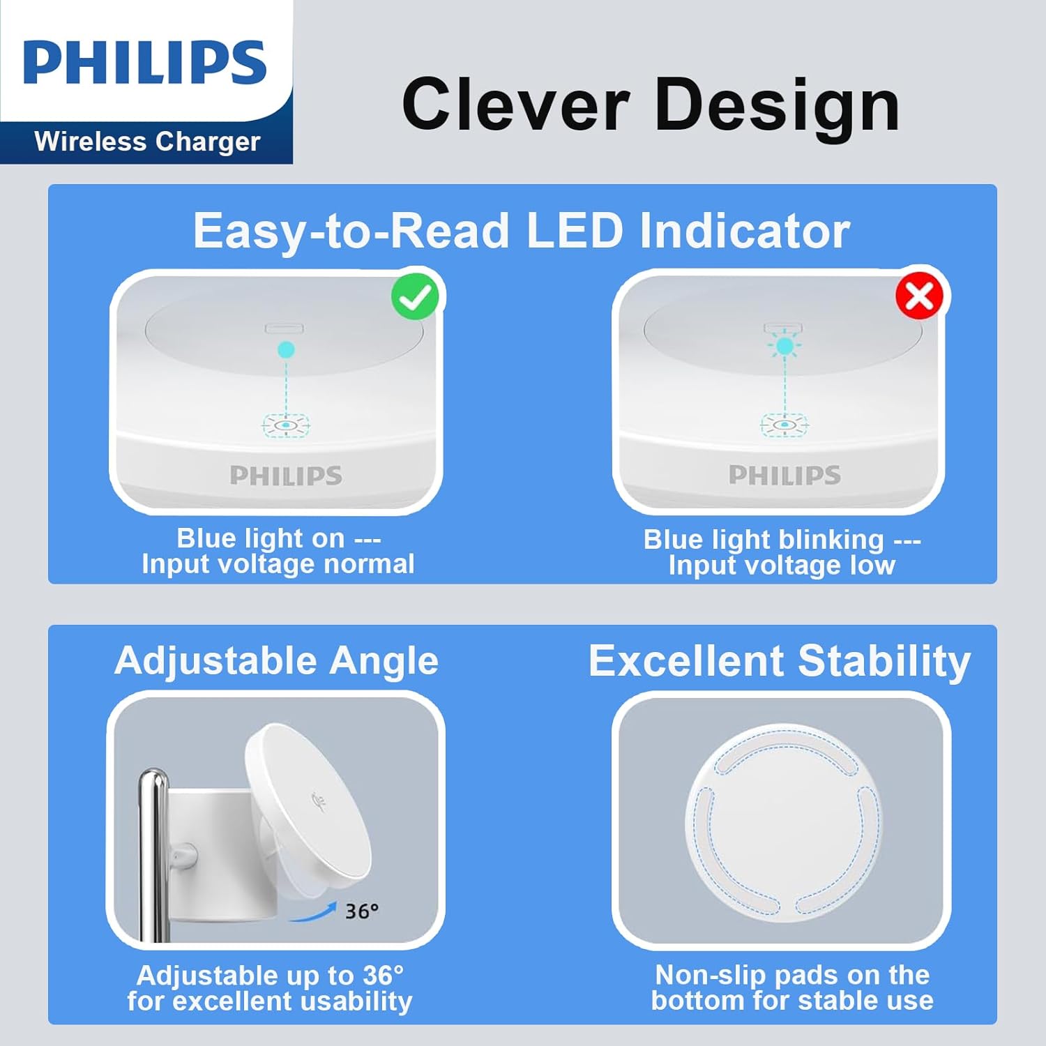 - 【Inspired Overheat Prevention Technology】 Designed with enhanced thermal management Philips safety standards, this charger helps prevent overheating by regulating power output and maintaining stable temperature control during long charging sessions. Moreover, built with an intelligent safety chip and strict Qi2‑certified protection protocols, continuously monitoring temperature and guarding against foreign objects, overvoltage, overcurrent, and short circuits for safe, reliable charging.