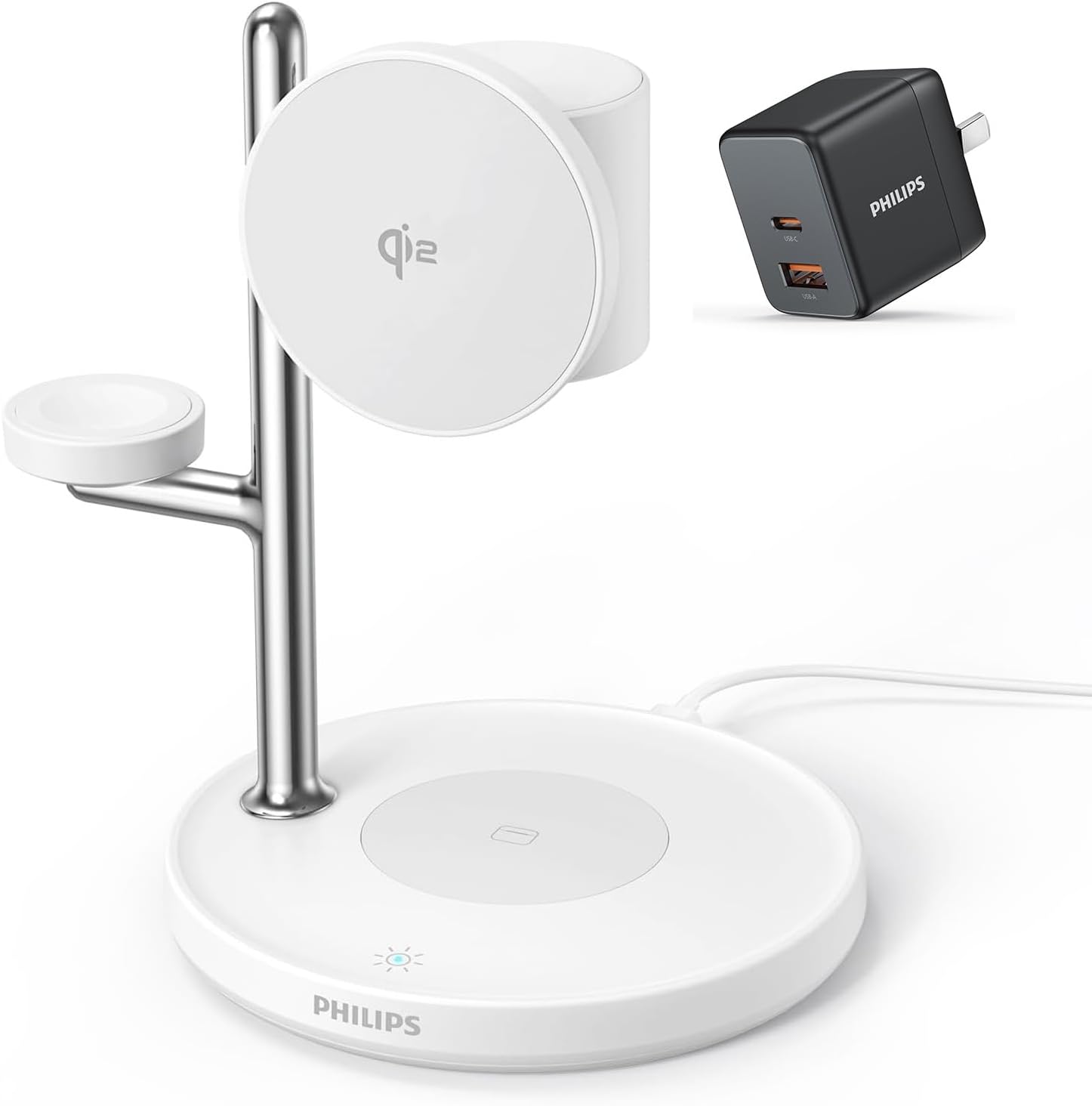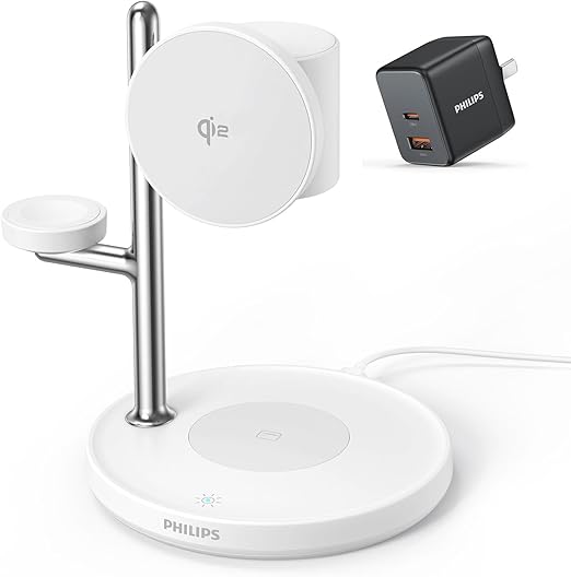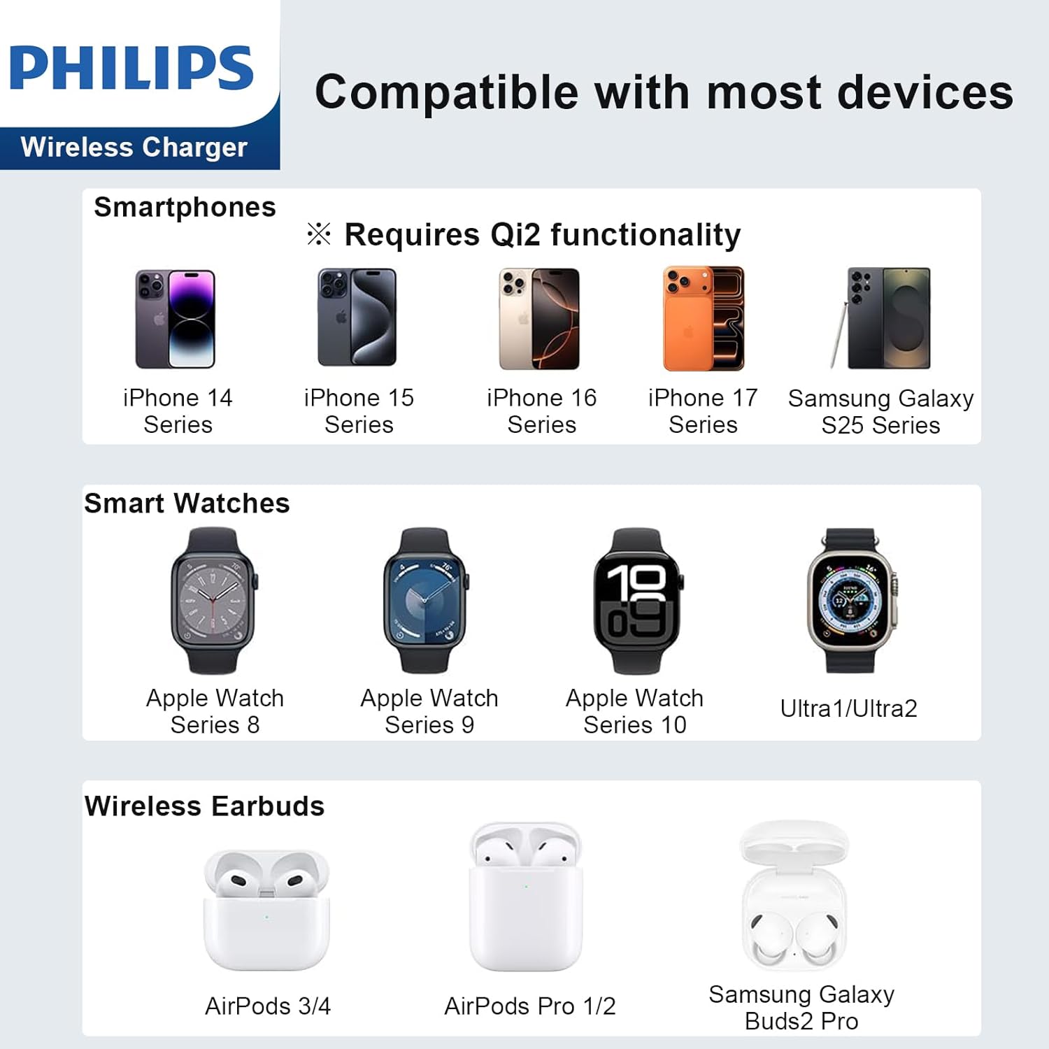 - 【Charge Up to 3 Devices at Once】 Power your iPhone, Apple Watch, and AirPods simultaneously with this Qi2 3‑in‑1 wireless charging station. Also compatible with Samsung Galaxy Devices. A great way to keep your nightstand or desk neat and cable‑free. (For best performance, use the included 30W Philips USB‑C PD adapter.)