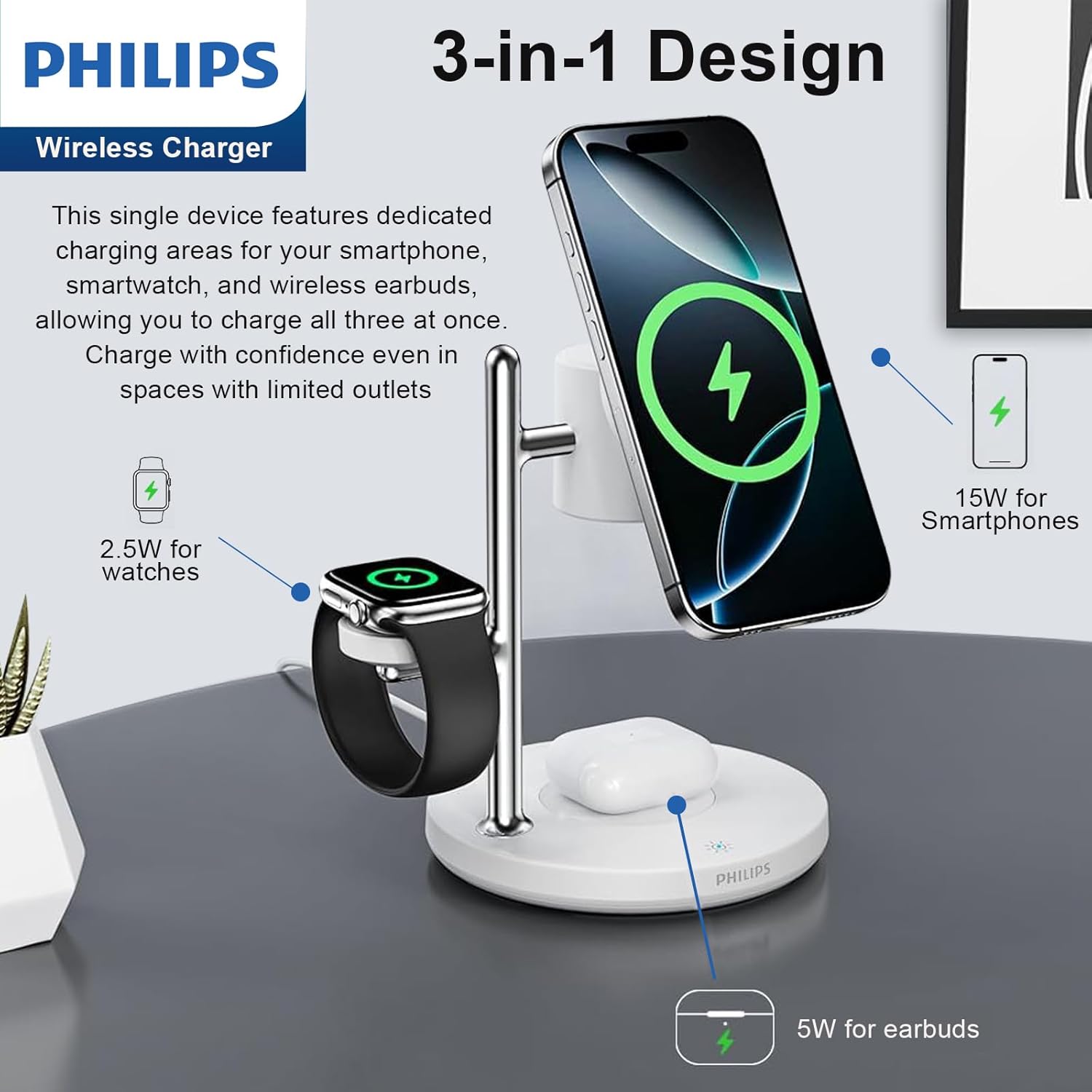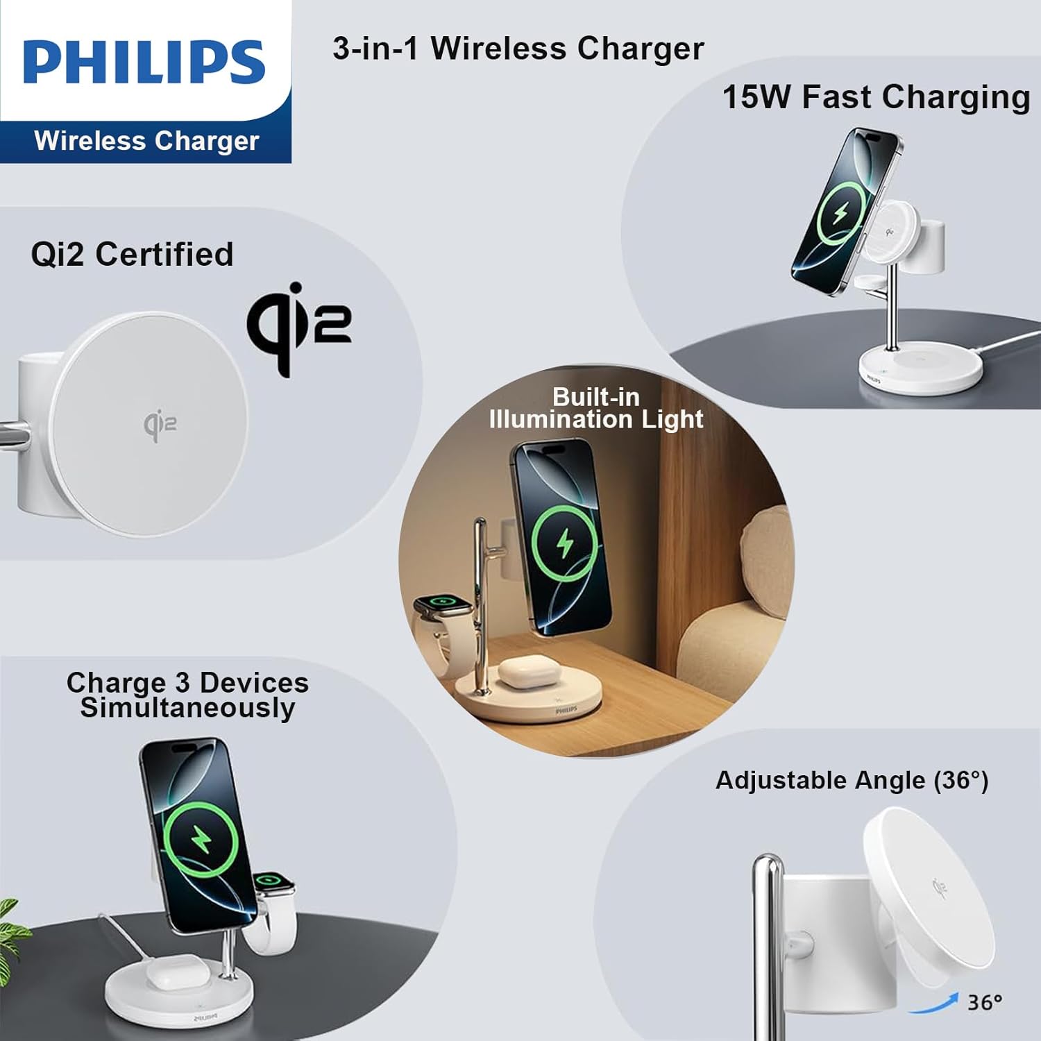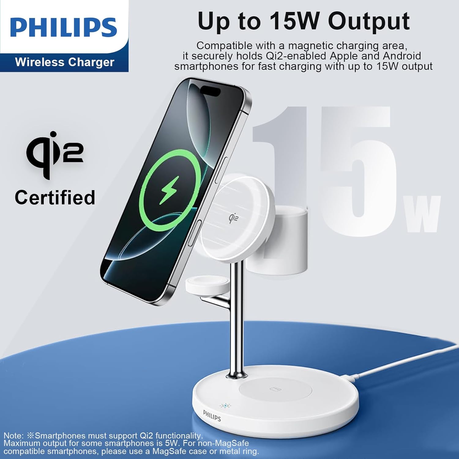 xPhilips 3 in 1 Reliable Wireless Charger, Qi Qi2 Certified 15W Fast Charging Station with adjustable Night Light, MagSafe-Compatible Stand for iPhone 17/16/15, Apple Watch, AirPods, Samsung Galaxy-White