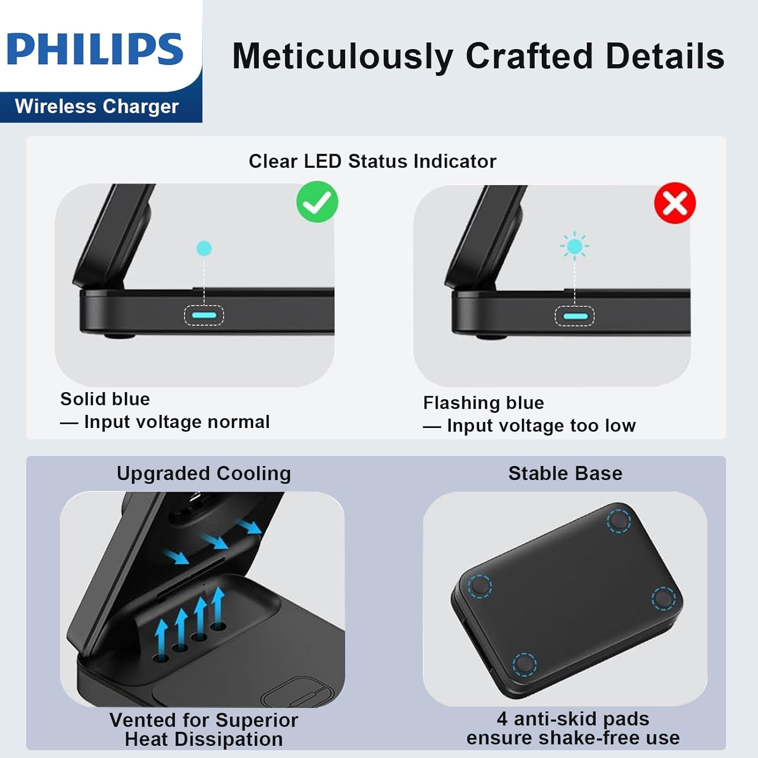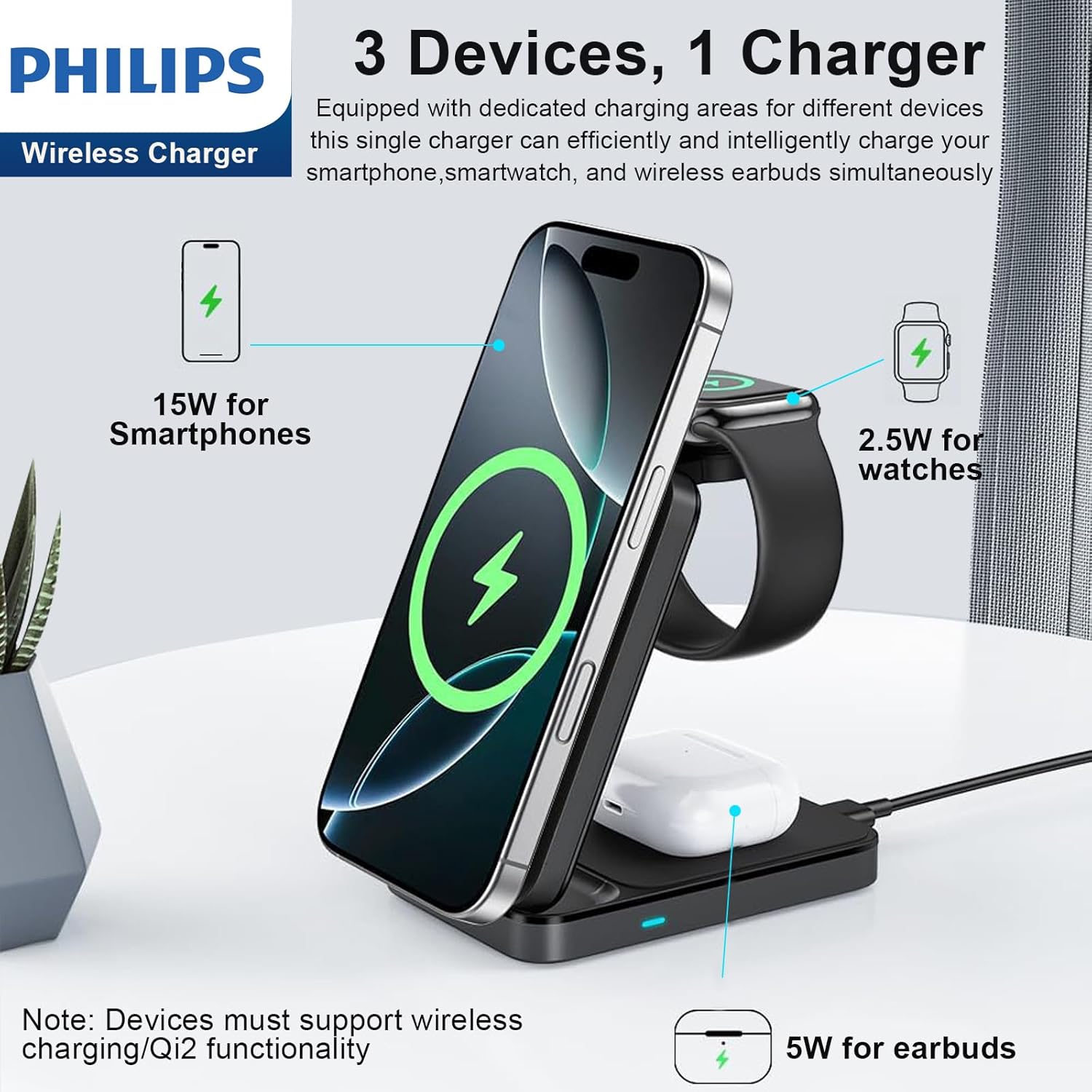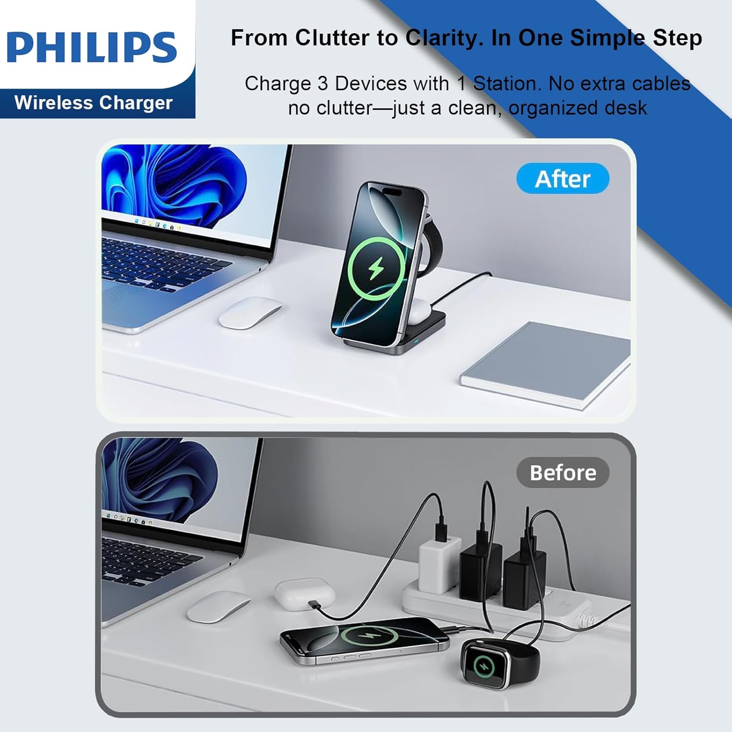 - Portable Charger for Travelling or Home: PHILIPS 3 in 1 wireless charging station provides a one-stop wireless charging solution for your iPhone, Apple Watch and AirPods. Great choice for organizing your home, office, travel, hotel or conference room. 3 in 1 wireless charging station lets you say goodbye to tangled wires and messy cables, charging station for multiple devices keeping your space neat and organized, making it a convenient charging solution for your busy lifestyle.