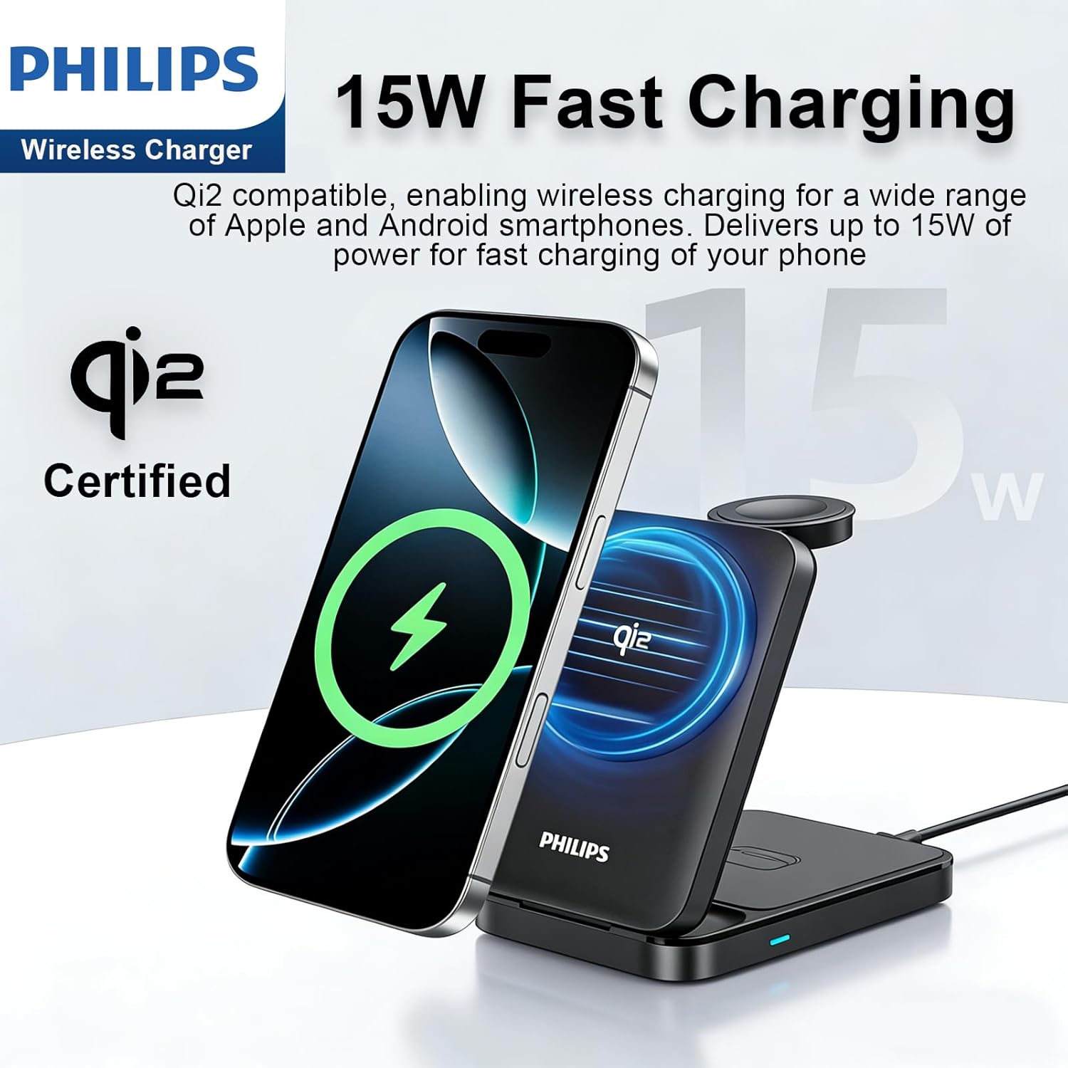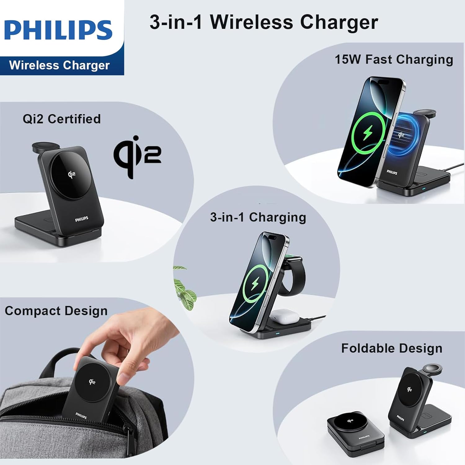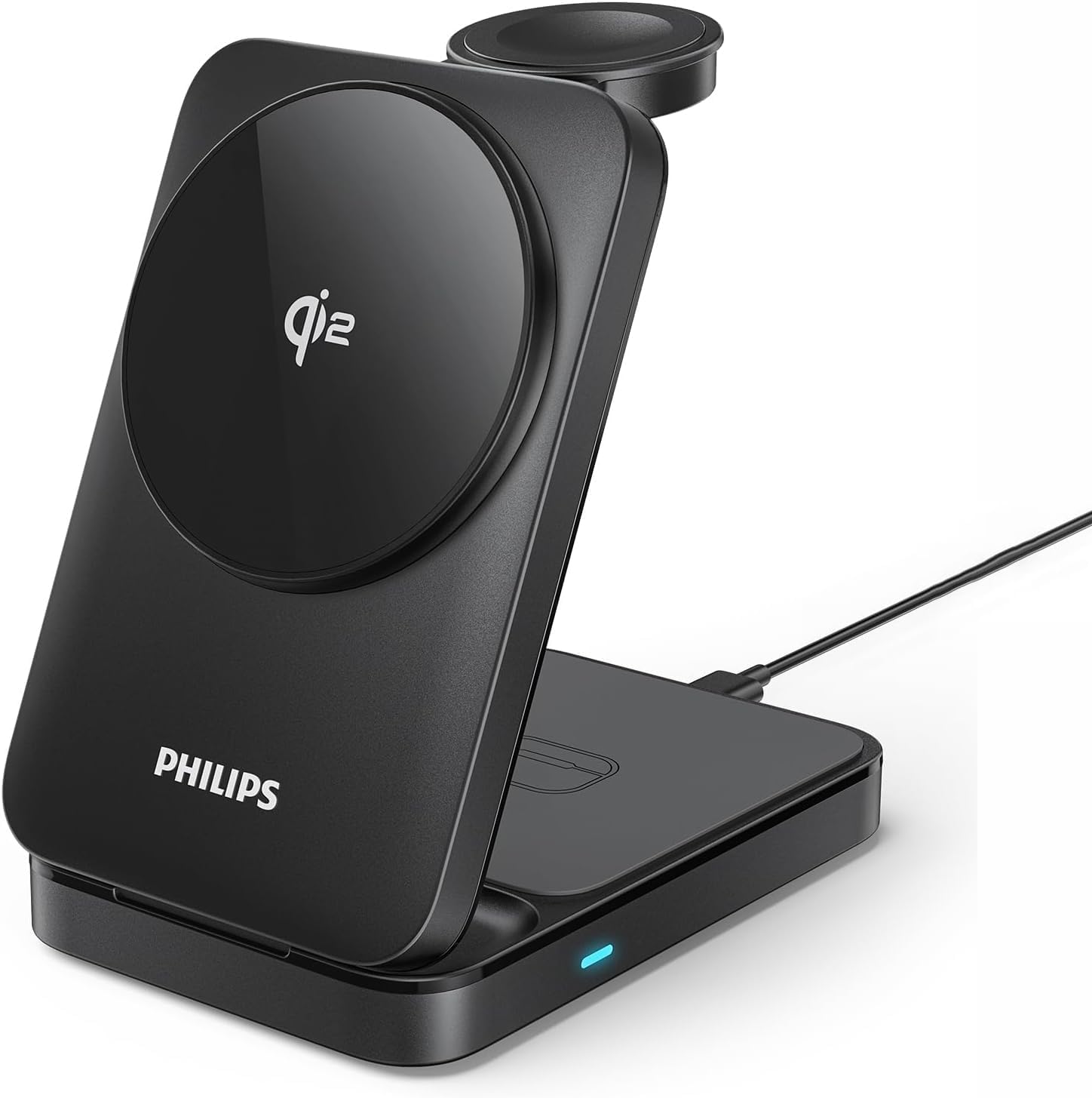 - Portable Charger for Travelling or Home: PHILIPS 3 in 1 wireless charging station provides a one-stop wireless charging solution for your iPhone, Apple Watch and AirPods. Great choice for organizing your home, office, travel, hotel or conference room. 3 in 1 wireless charging station lets you say goodbye to tangled wires and messy cables, charging station for multiple devices keeping your space neat and organized, making it a convenient charging solution for your busy lifestyle.
